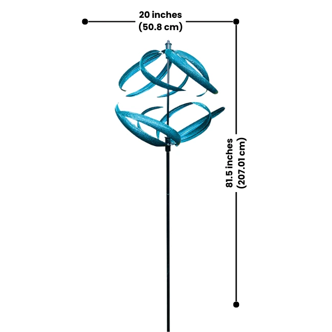 Transform your outdoor space into a kinetic art display with the Aqua Swirl Wind Spinner. This towering 81.5-inch wind sculpture features dual, half-circle spinners that create an open, spherical design, moving gracefully with every breeze.