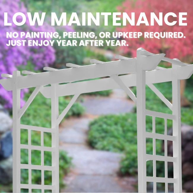 Designed to be as functional as it is beautiful, the side panels feature diagonal lattice patterns specifically crafted to support climbing vines like clematis, roses, or ivy. Crafted from premium, UV-protected vinyl, this arbor is built to withstand the elements without fading, cracking, or peeling. Unlike wood, it requires zero staining or paintingβsimply rinse with a garden hose to keep it looking brand new.