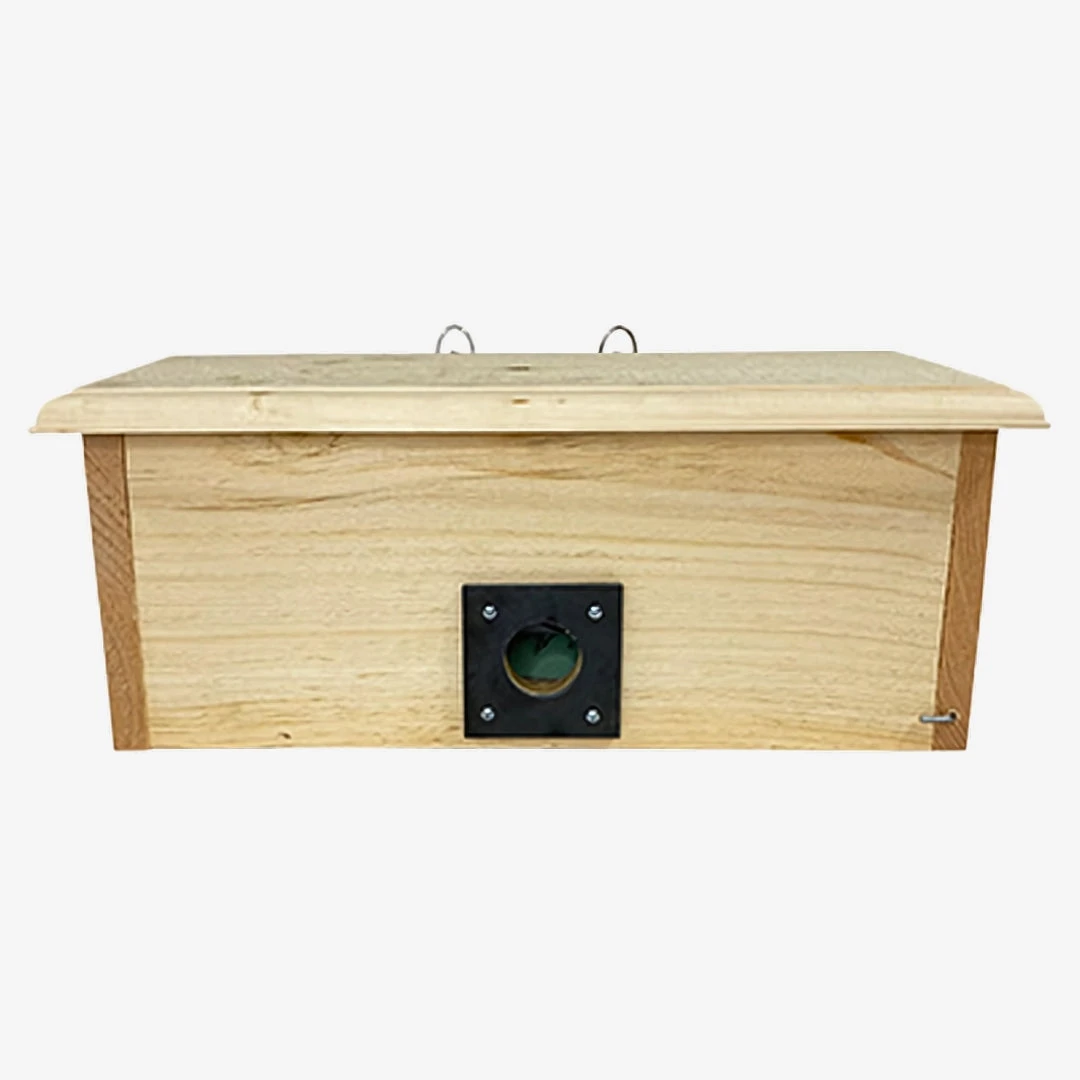 Provide songbirds with a warm winter retreat using the Coveside Horizontal Winter Roost. Featuring a 1.5″ entrance hole with a protective slate guard to prevent squirrel damage, this shelter traps warm air inside for cozy roosting. Extended perches offer space for multiple birds, and the front panel lifts for easy cleaning and observation. The slanted roof directs water runoff, and metal hangers allow simple mounting to a tree or post. Crafted from durable eastern white pine, this shelter will naturally age to a beautiful gray and never requires painting or staining. Made in the USA.