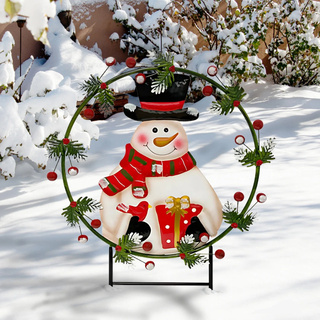 Welcome the winter season with our cheerful Land and Sea Metal Snowman Yard Art! This 32″ holiday stake decor features a dapper top hat, a rosy-cheeked smile, and a whimsical red-and-green scarf. Adorned with a green wreath and holly, this metal snowman comes with two stakes for easy insertion and a stable horizontal bar.