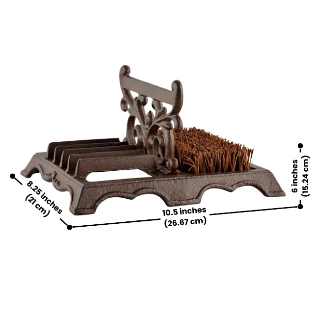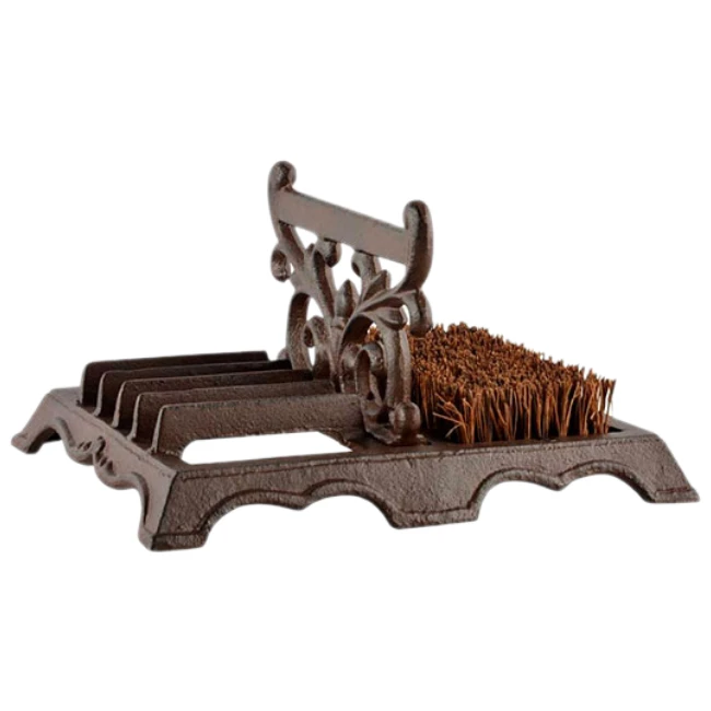 A raised center scraper further enhances cleaning efficiency, ensuring even the toughest mud is removed. Decorative leaf and scroll detailing add an elegant touch, making this a beautiful yet practical addition to any porch, garage, or mudroom. With flared feet for stability and a heavy-duty cast iron frame, this timeless boot brush is built to withstand years of use.