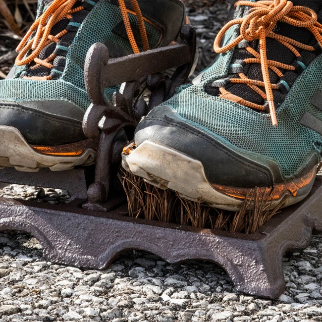 Keep your entryway clean while adding a classic touch with the MudGuard Cast Iron Boot Brush. Designed for both function and style, this durable cast iron piece provides an easy way to remove dirt and debris from your shoes before entering your home. The dual-sided cleaning design features sturdy bristles on one side to scrub away dry dirt, while five cast iron slats on the other side allow you to wipe your foot with ease.