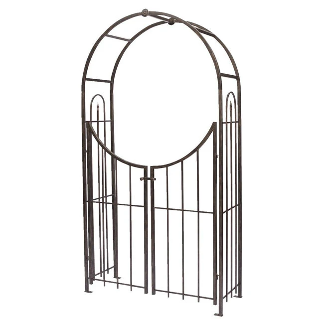 Adding to its charm, the gate panels curve downward to create a circular design when closed, enhancing its whimsical yet structured aesthetic. A floral finial at the top adds an extra decorative touch, making this arbor a stunning focal point for any garden path or entryway.