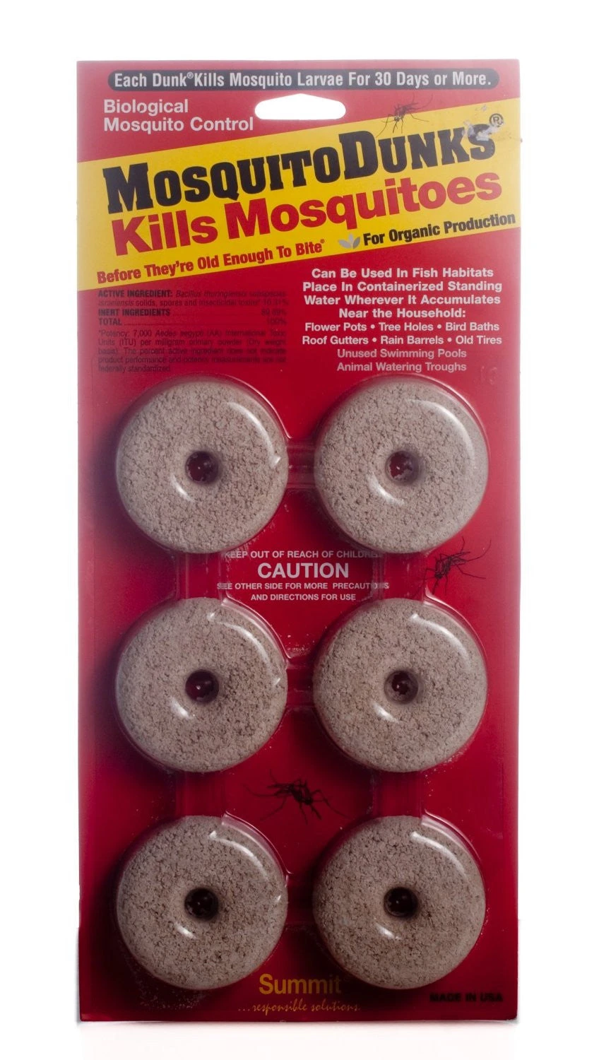 Safe and easy to use in bird baths, fountains, ponds, or anywhere water may accumulate or become stagnant. Each dunk kills mosquito larvae for 30 days or more and treats 100 square feet of surface water.