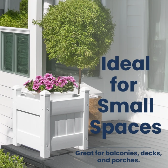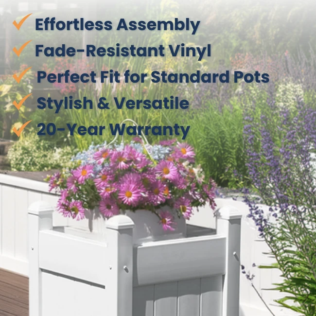 Crafted from UV-stabilized vinyl, this planter won’t fade, yellow, or rot, ensuring it stays bright white for years. Proudly made in the USA and backed by a 20-year warranty, it’s built to last!
