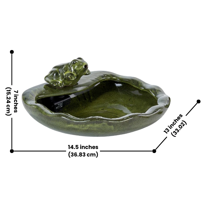 Elevate your outdoor ambiance with the soothing sounds of nature and the playful character of our Ceramic Frog Solar Fountain. This handcrafted-style green ceramic frog perches atop a matching bowl, gracefully pouring a gentle stream of water that creates a peaceful atmosphere for your garden, patio, or balcony.