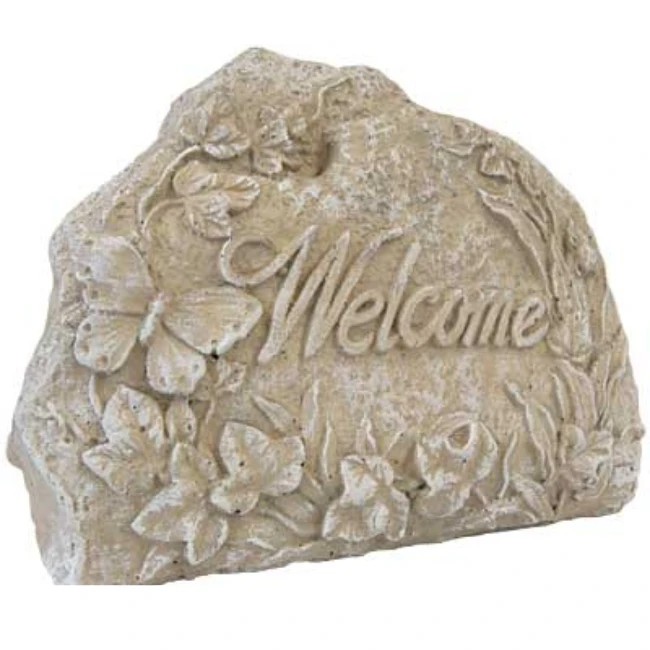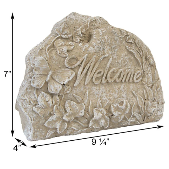 This garden accent features a rich Beige Desert Sand finish highlighted by Ivory accents that bring out the intricate, hand-cast details. The surface is adorned with raised textures of delicate leaves, a fluttering butterfly, and a whimsical ladybug, all surrounding an elegant italicized ‘Welcome’ script. Its substantial concrete construction ensures it stays securely in place while adding a timeless, nature-inspired aesthetic to your landscaping.